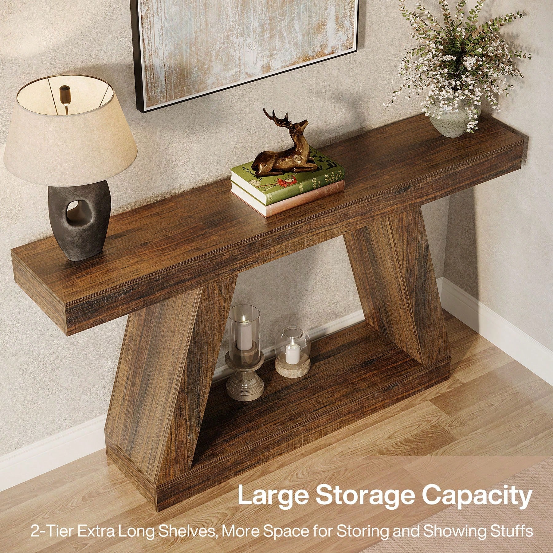 Bring rustic charm and added storage to your entryway, hallway, or living room with this 55″ farmhouse-style console table. Featuring a 2-tier design, it offers both a spacious tabletop for displaying décor and a lower shelf perfect for baskets, books, or storage bins. Crafted from durable engineered wood with a distressed finish, it combines classic style with practical function. The open-frame structure and clean lines give it a light, airy look that fits perfectly behind sofas or along narrow walls. Designed for easy assembly with clear instructions included.