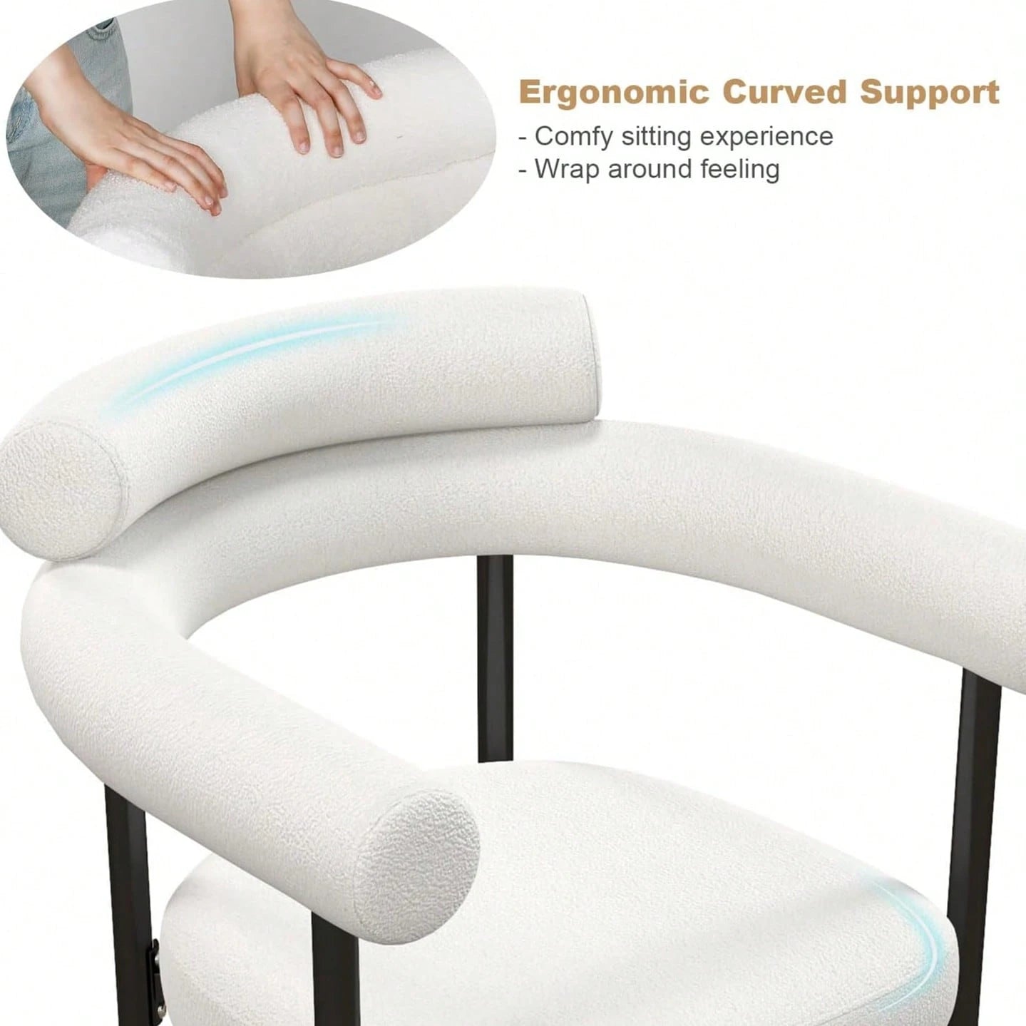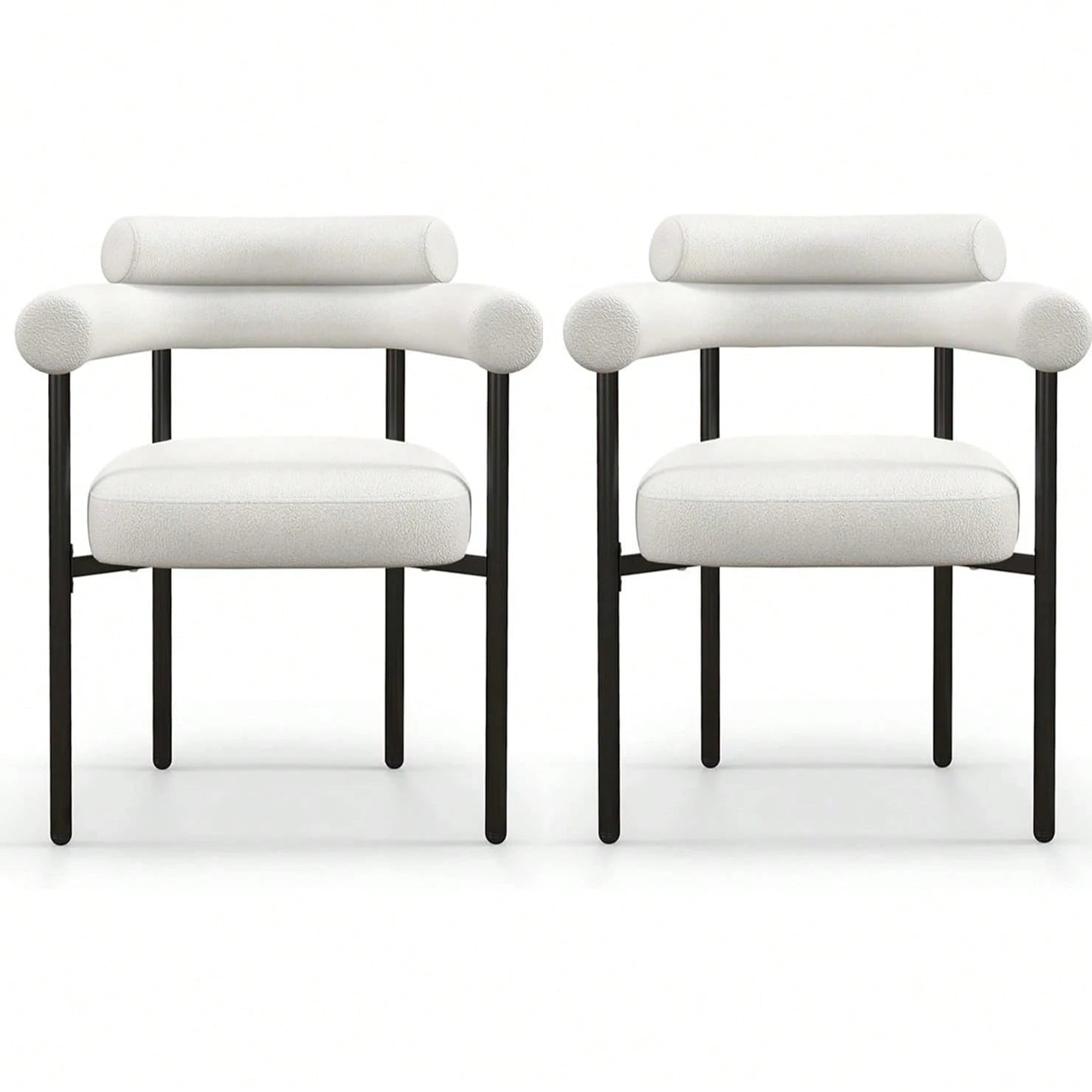 Upgrade your dining experience with this set of two upholstered boucle dining chairs. Featuring a curved, ergonomic backrest and cushioned seat wrapped in soft, textured boucle fabric, these chairs strike the perfect balance between comfort and contemporary style. The minimalist design and metal legs with a matte black finish offer a modern accent to dining rooms, breakfast nooks, or even home offices. Functional and stylish, these chairs are versatile enough to suit both everyday meals and special occasions.