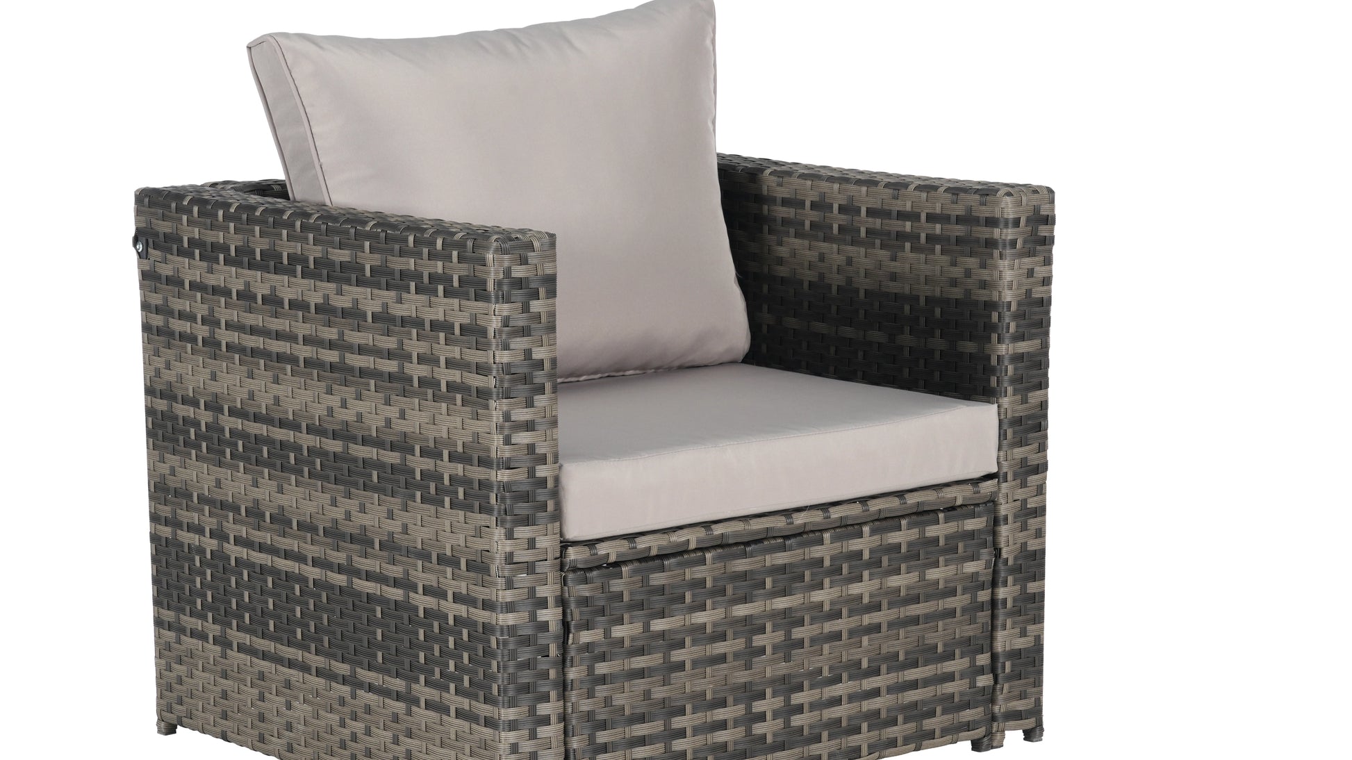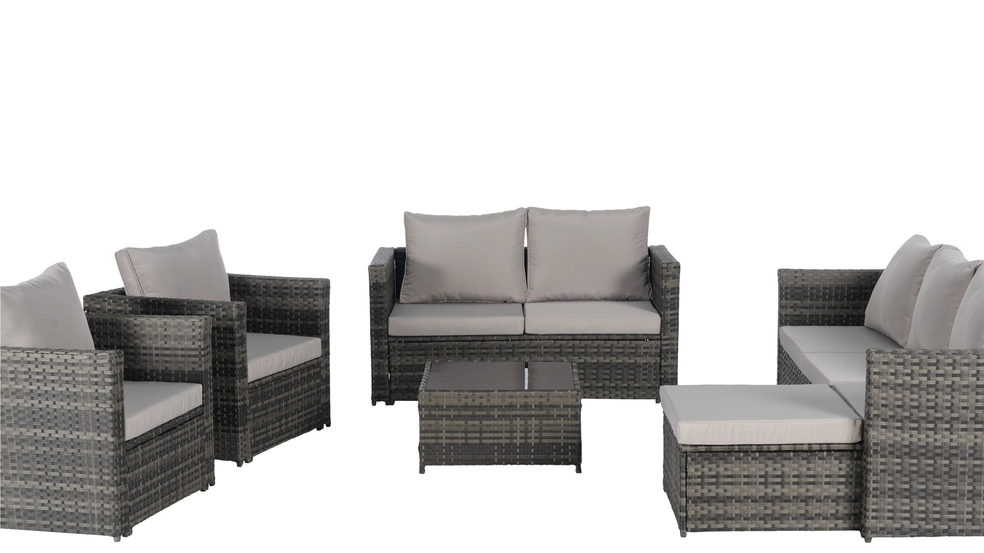 Craft a cozy outdoor gathering space with this 5‑piece all‑weather wicker sectional set—designed for ultimate comfort and effortless style. The hand‑woven PE rattan wraps a sturdy, rust‑resistant powder‑coated steel frame, ready for patio, porch, or poolside lounging . Plush, UV‑protected cushions with high‑resilience foam offer soft yet supportive seating, while removable, zippered covers make cleanup easy. A tempered‑glass coffee table anchors the ensemble, adding a polished, practical touch. The modular design—with one three‑seat sofa, two chairs, two ottomans, and table—lets you easily reconfigure the layout to fit any space or occasion .