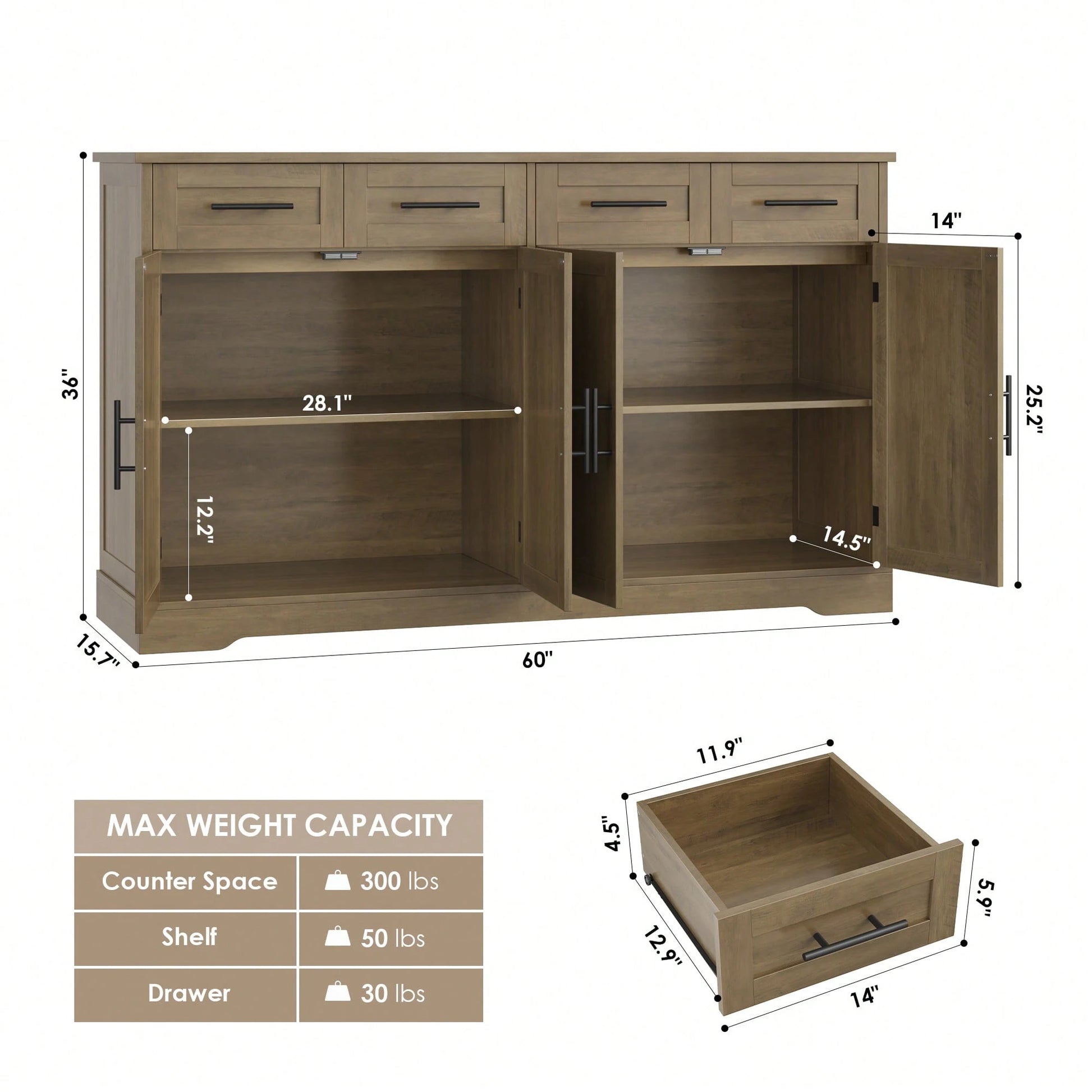 This modern kitchen storage cabinet boasts spacious storage with 4 concealed cupboards and an extra large 60" wide tabletop. Its timeless design adds elegance to any home setting and is built with high-quality materials for long-lasting durability and stability, holding up to 450 lbs.
