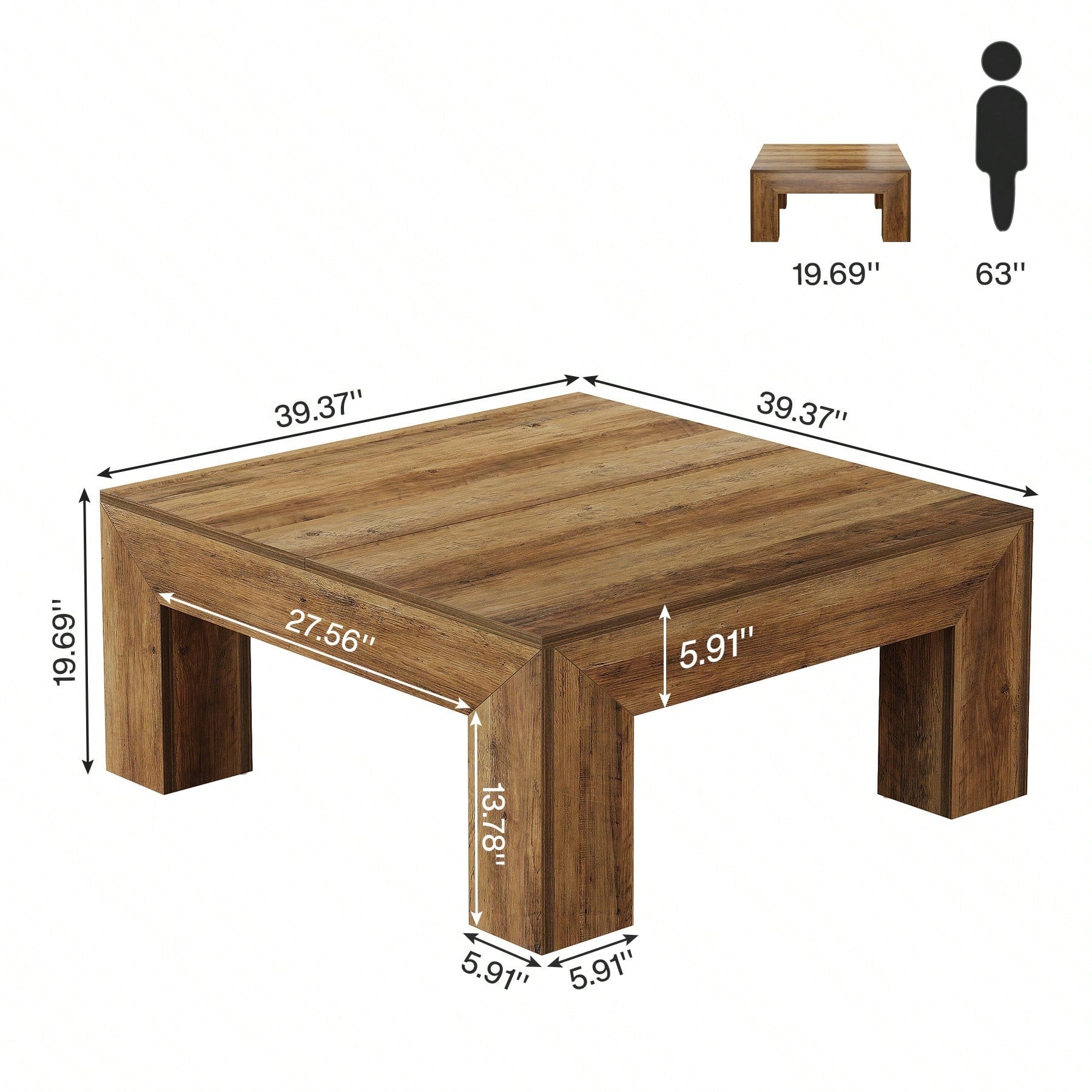 Make a bold statement in your living room with this 39.4″ square farmhouse-style coffee table. Crafted entirely from durable materials, a rich wood finish and sturdy wooden legs, this table blends rustic charm with modern simplicity. Its large surface area is ideal for serving, displaying décor, or anchoring your seating area. With clean lines and easy assembly, it's a stylish and functional centerpiece for any space.