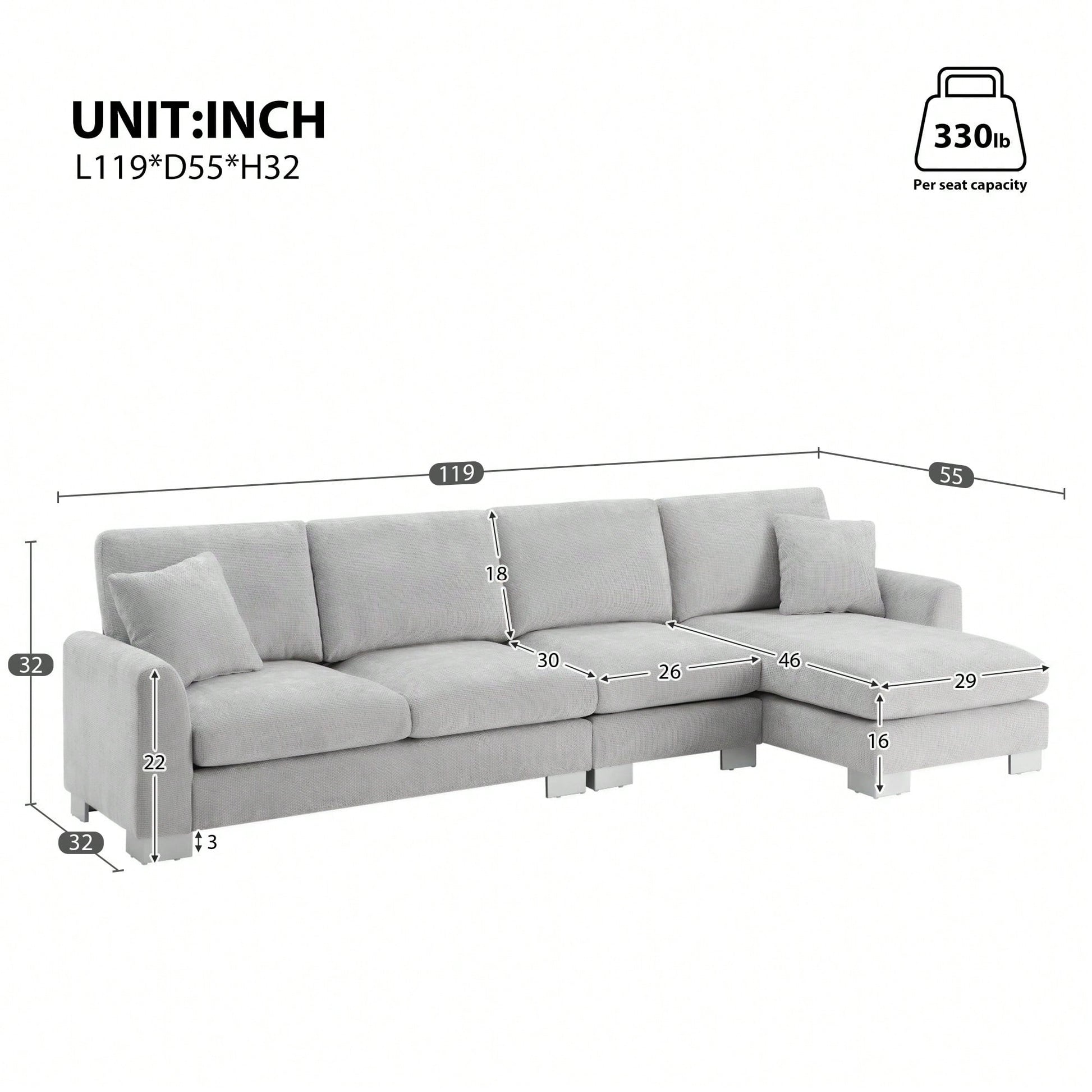Elevate your living space with this oversized 5‑seat L‑shaped sectional sofa, wrapped in soft chenille upholstery and ideal for families, entertainers, or spacious lounges. The generous chaise and deep seats offer luxurious comfort for movie nights or casual lounging, while the included plush pillows add both style and support. Crafted with a sturdy hardwood frame and dense foam cushions, this sectional blends durability with elegance and is perfectly suited for modern apartments, offices, or family rooms.
