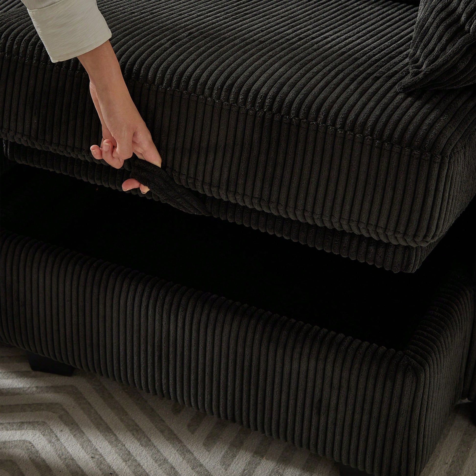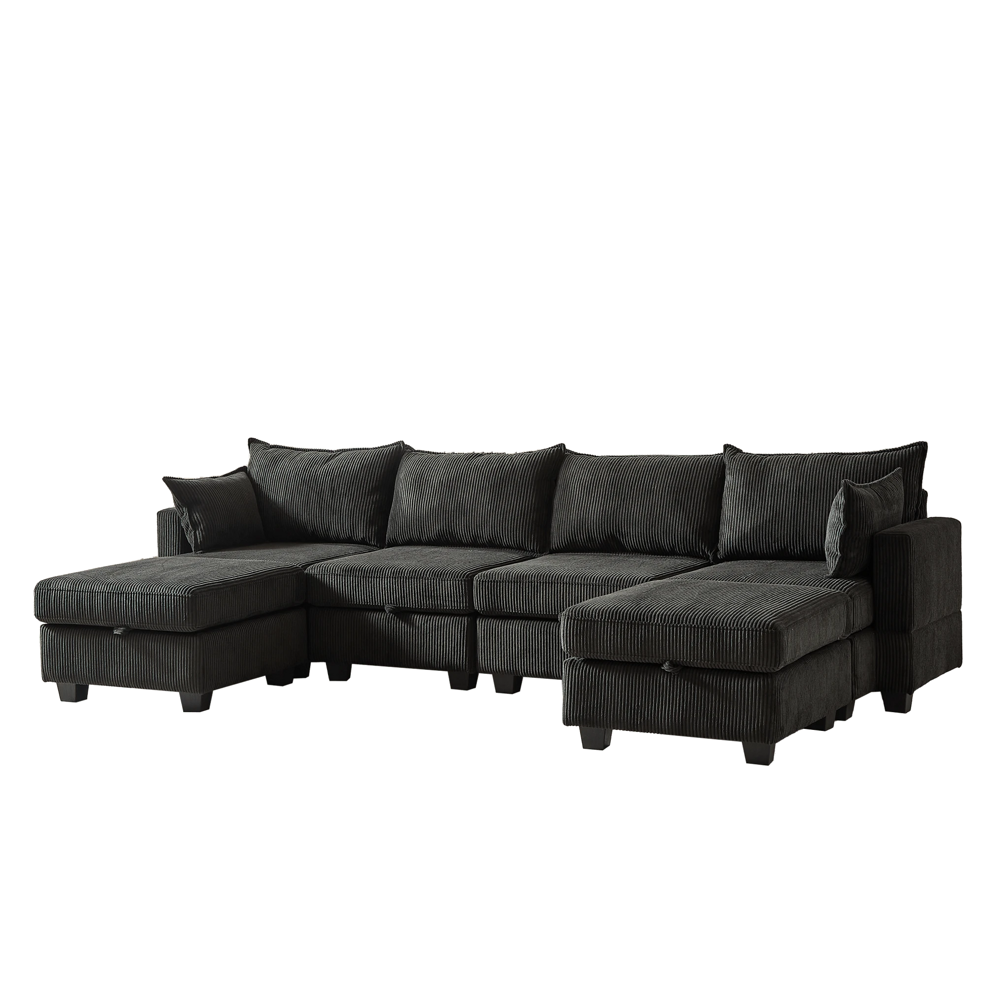 Create your perfect lounge zone with this spacious 113.5″ modular U‑shaped sectional, upholstered in soft corduroy for tactile comfort and modern appeal. The customizable setup allows you to configure the sofa, chaise, and storage ottoman to match your space—ideal for watching movies, entertaining, or cozying up with family.