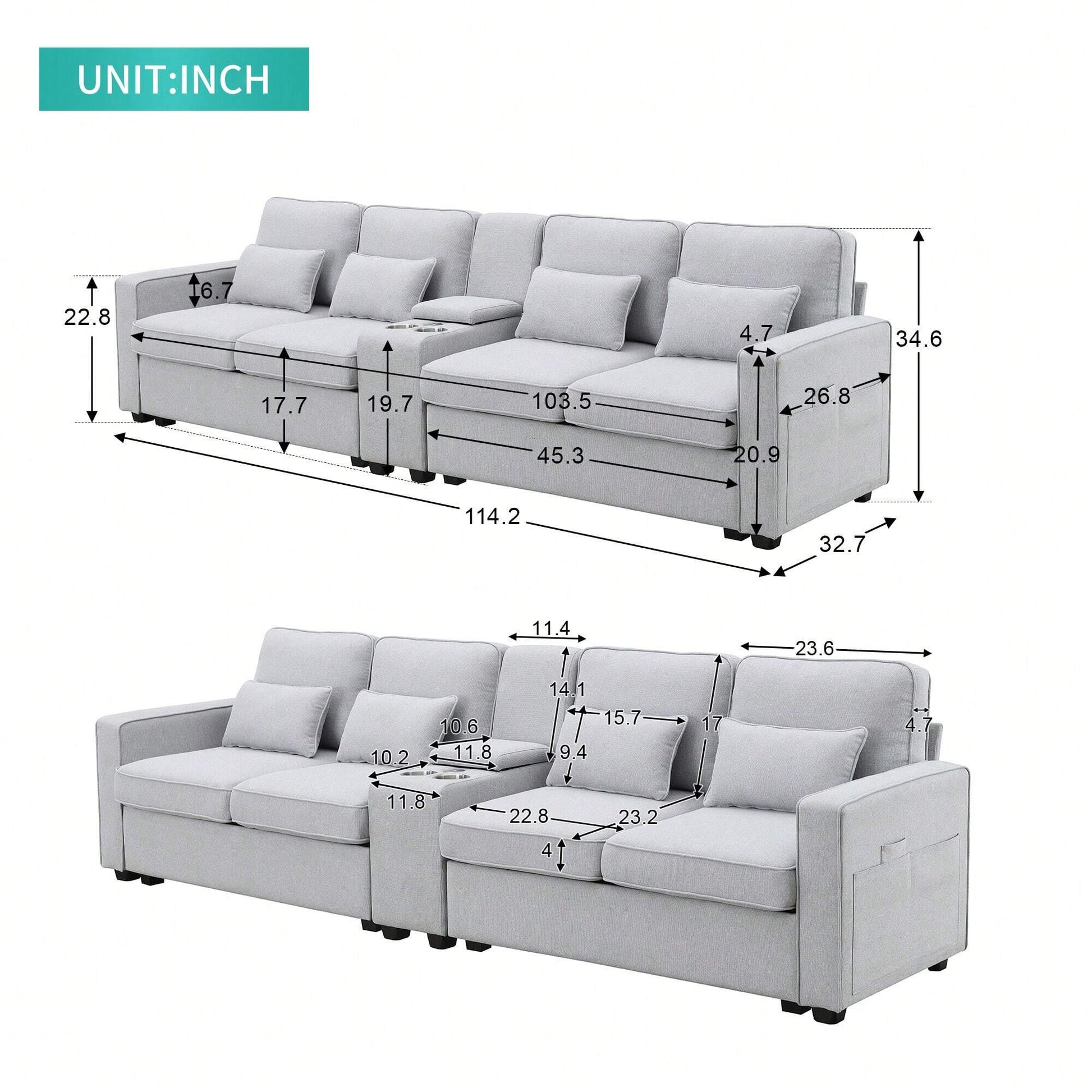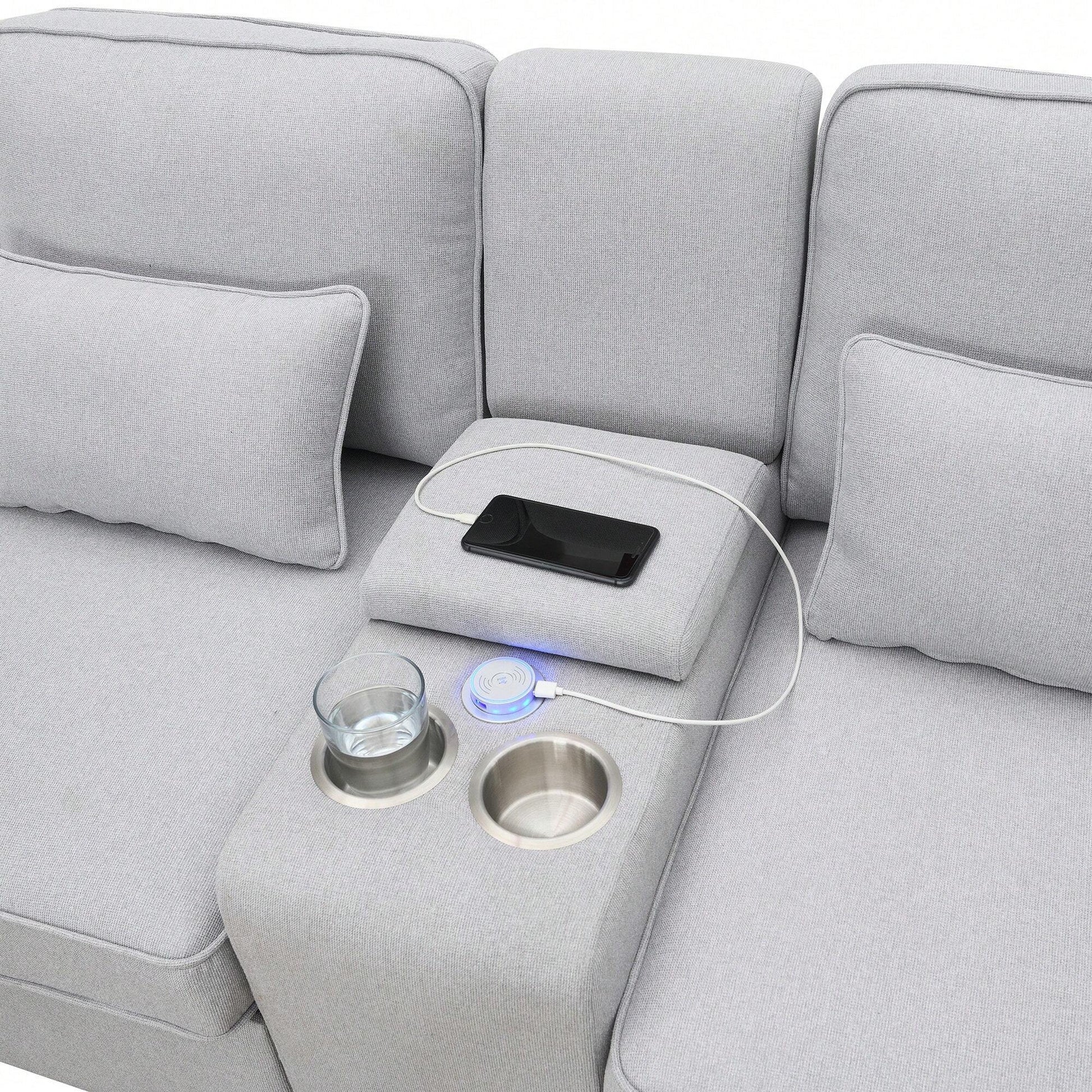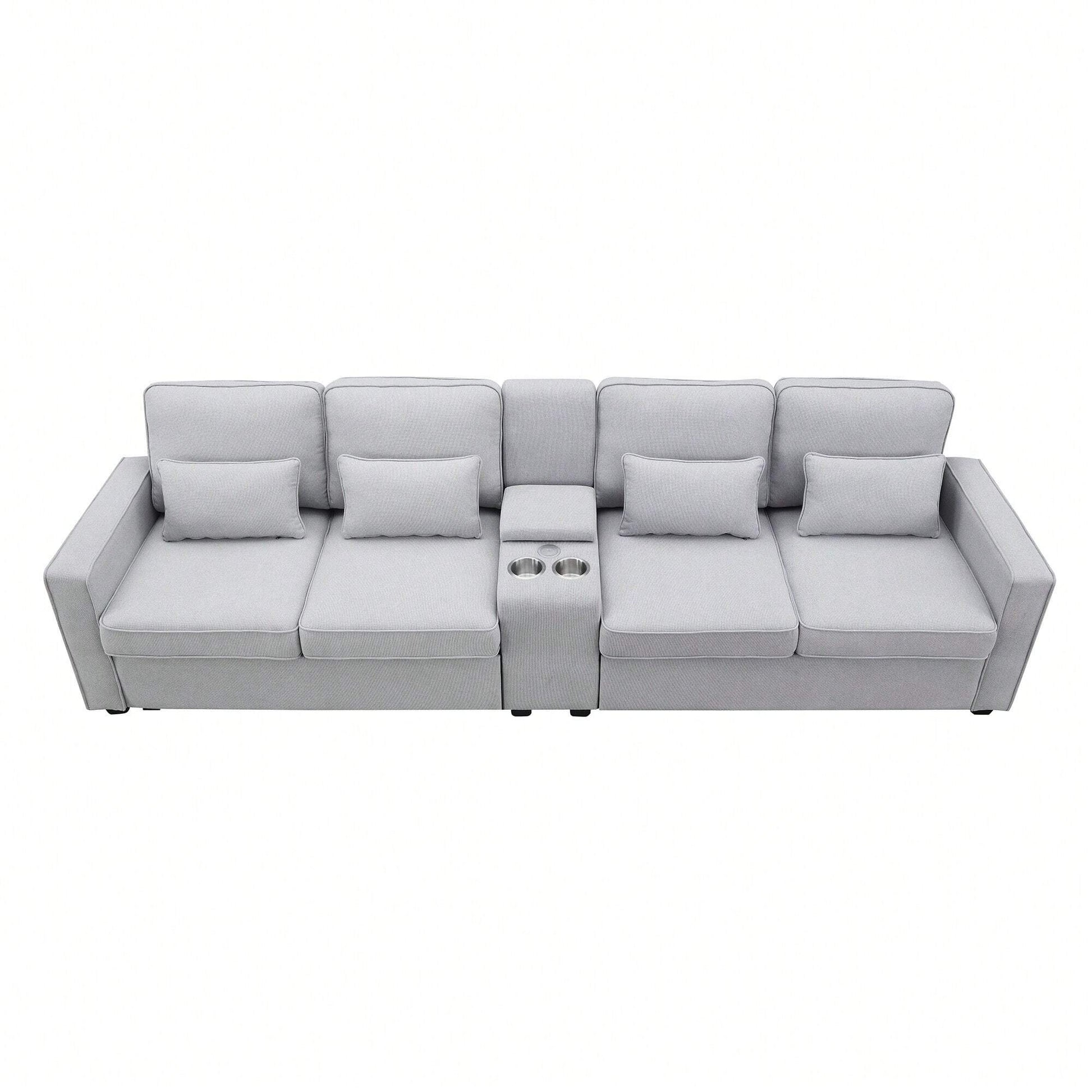 Maximize your living space with this modern 4-seat upholstered sofa, designed for both comfort and function. Featuring a sleek, space-saving profile and a soft linen fabric finish, this sofa is perfect for lounging, entertaining, or family nights in. It includes a built-in hidden storage and two integrated cupholders—ideal for keeping essentials close at hand. The clean lines, generous seating, and smart details make it a practical yet stylish centerpiece for your living room or apartment setup.