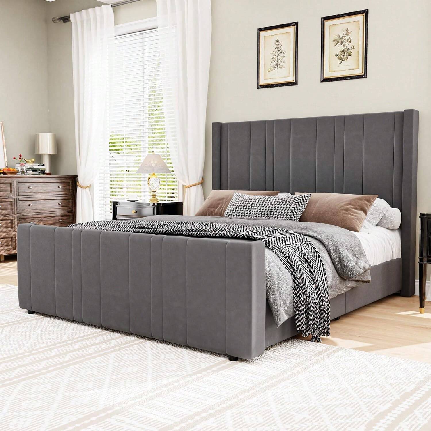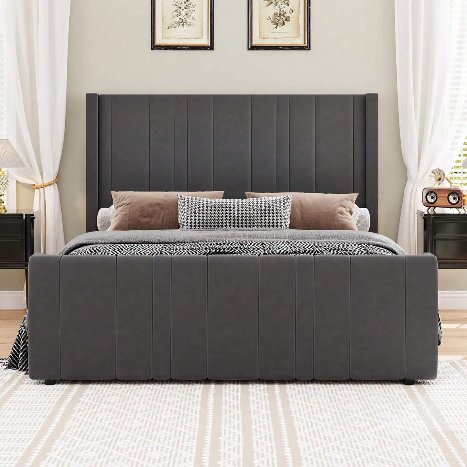 This upholstered bed frame features a tall 47.3” headboard and 21.7” footboard with soft velvet fabric and vertical channel tufting, offering both style and support for your back and neck. Wrapped in premium stain-resistant velvet, it brings a modern, elegant touch to any bedroom. The sturdy wood frame supports up to 1000 lbs with durable slats and center legs—no box spring needed. EVA foam padding ensures a quiet, comfortable sleep. Easy to assemble in about 2 hours with clearly labeled parts; two adults recommended.