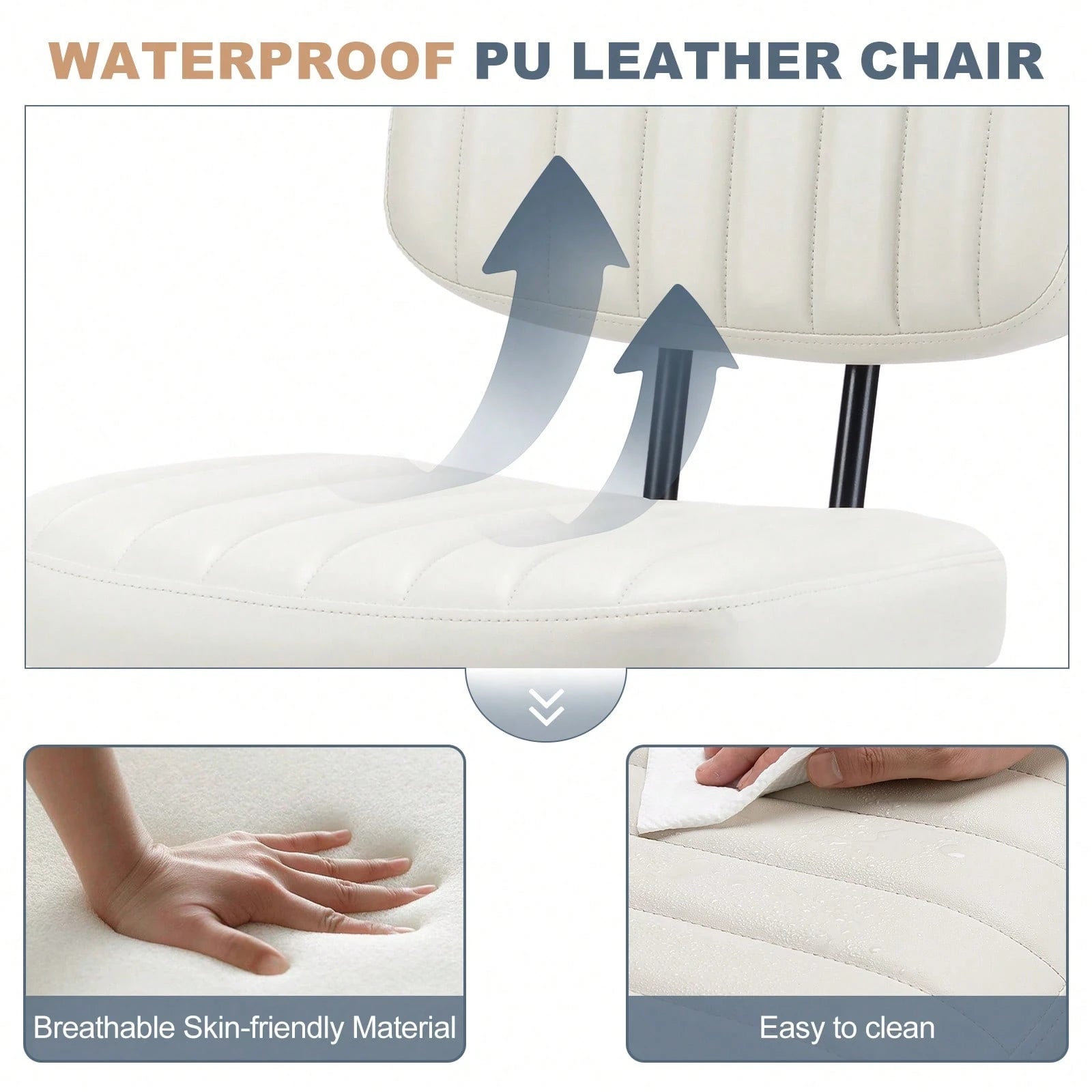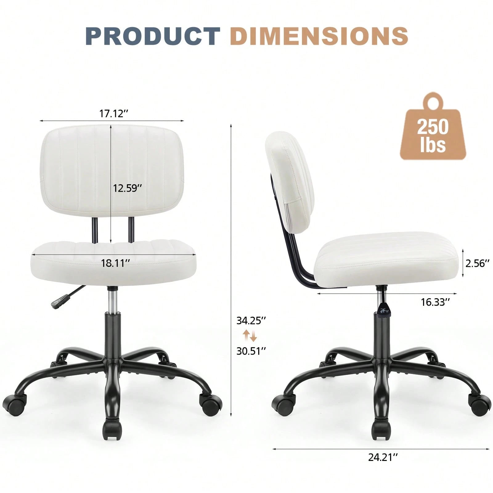 Bring modern comfort to your workspace with this Armless Office Chair. Upholstered in sleek PU leather, this compact desk chair is designed without arms to maximize mobility and fit neatly under desks or vanities. It features a smooth 360° swivel base, height-adjustable seat, and five caster wheels for effortless movement. The curved backrest and cushioned seat provide ergonomic support, making it a stylish and functional choice for home offices, dorm rooms, or makeup stations.