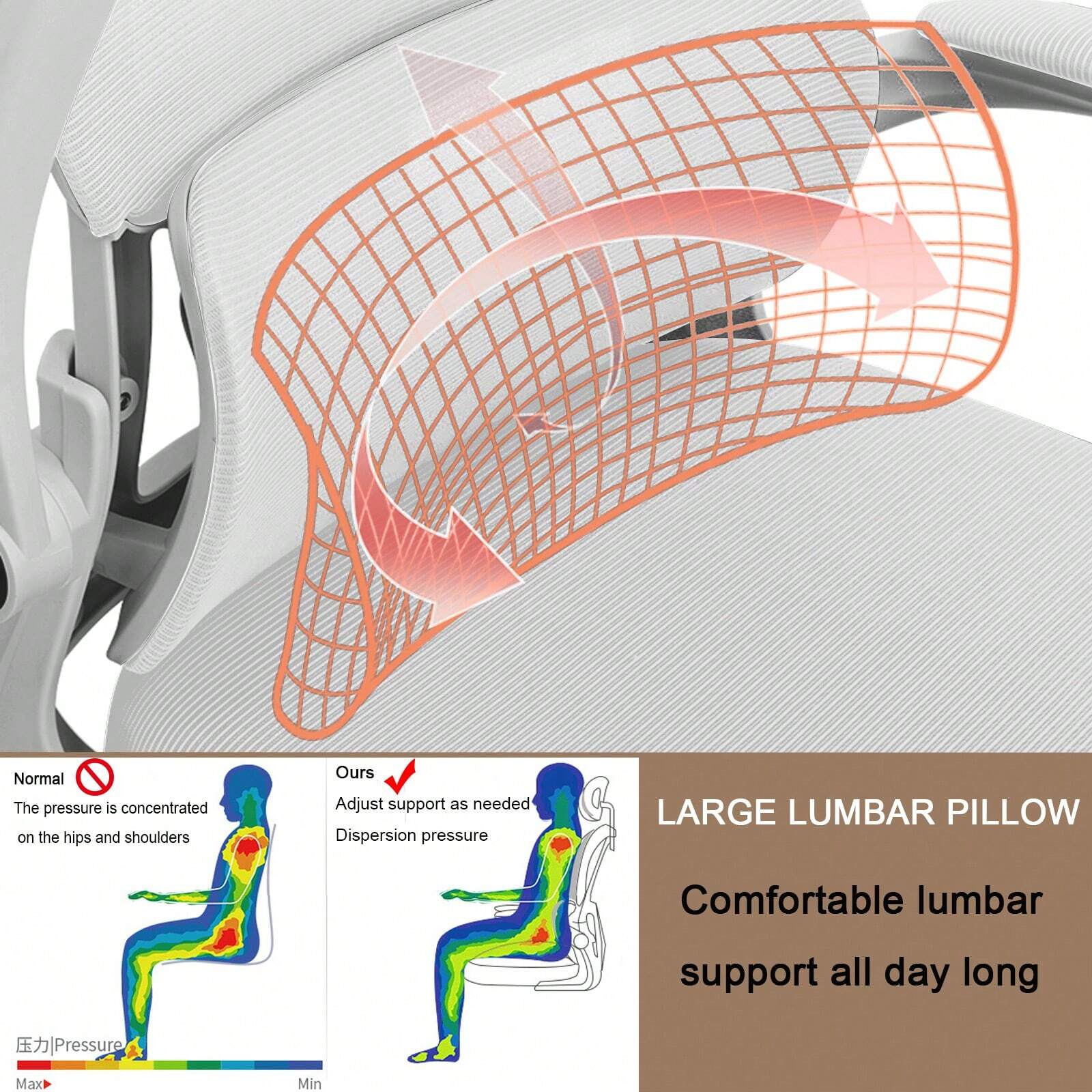 Work in comfort and style with this ergonomic high-back office chair, designed to support long hours at your desk. Featuring breathable mesh backrest and headrest, built-in lumbar support, and flip-up padded armrests, this chair combines function with flexibility. The adjustable seat height, 360° swivel base, and smooth-rolling casters make it ideal for work, study, or gaming. Whether in your home office or workspace, this chair delivers customizable support to help you stay focused and comfortable.