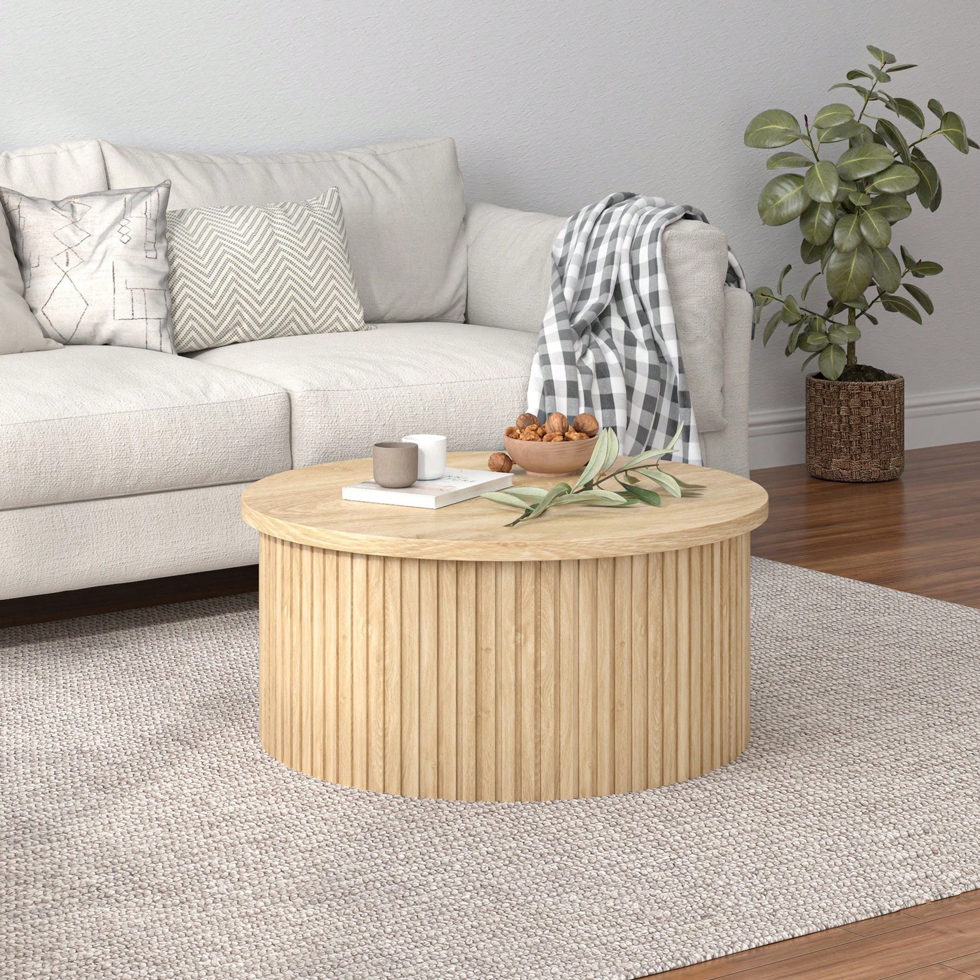 Add charm and clever functionality to your living room with this 33″ round lift-top coffee table, designed in a modern farmhouse style. The circular silhouette offers soft edges ideal for family spaces, while the lift-top design reveals hidden storage, perfect for stashing remotes, books, or blankets. Crafted from durable engineered wood with a rustic finish, it blends form and function effortlessly. A lower open shelf provides added space for display or organization. Whether you're entertaining or relaxing, this coffee table elevates both style and convenience in your space.