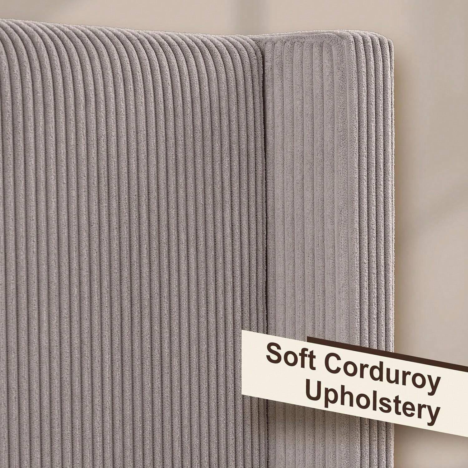 Elevate your bedroom with this elegant upholstered platform bed frame featuring a 50.8" wingback headboard. The bed is upholstered in soft corduroy fabric, offering a luxurious feel and timeless appeal. Solid wood legs provide sturdy support and a touch of natural warmth. Designed to eliminate the need for a box spring, this bed frame offers a noise-free and comfortable sleep experience. Its neutral tones and classic design make it a versatile addition to various bedroom aesthetics.