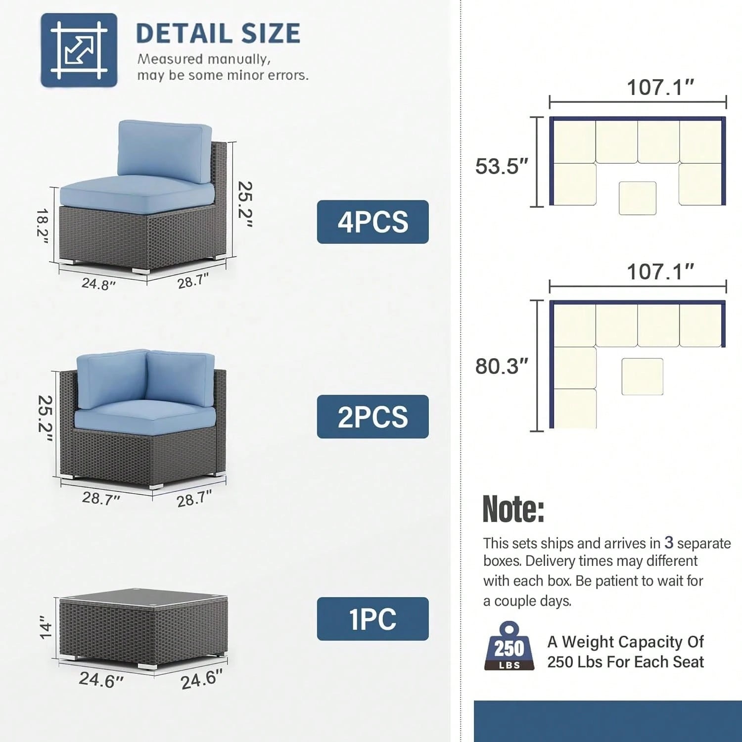 Each Sofa Piece: Approx. 26.37″ L × 26.37″ W × 24.8″ H