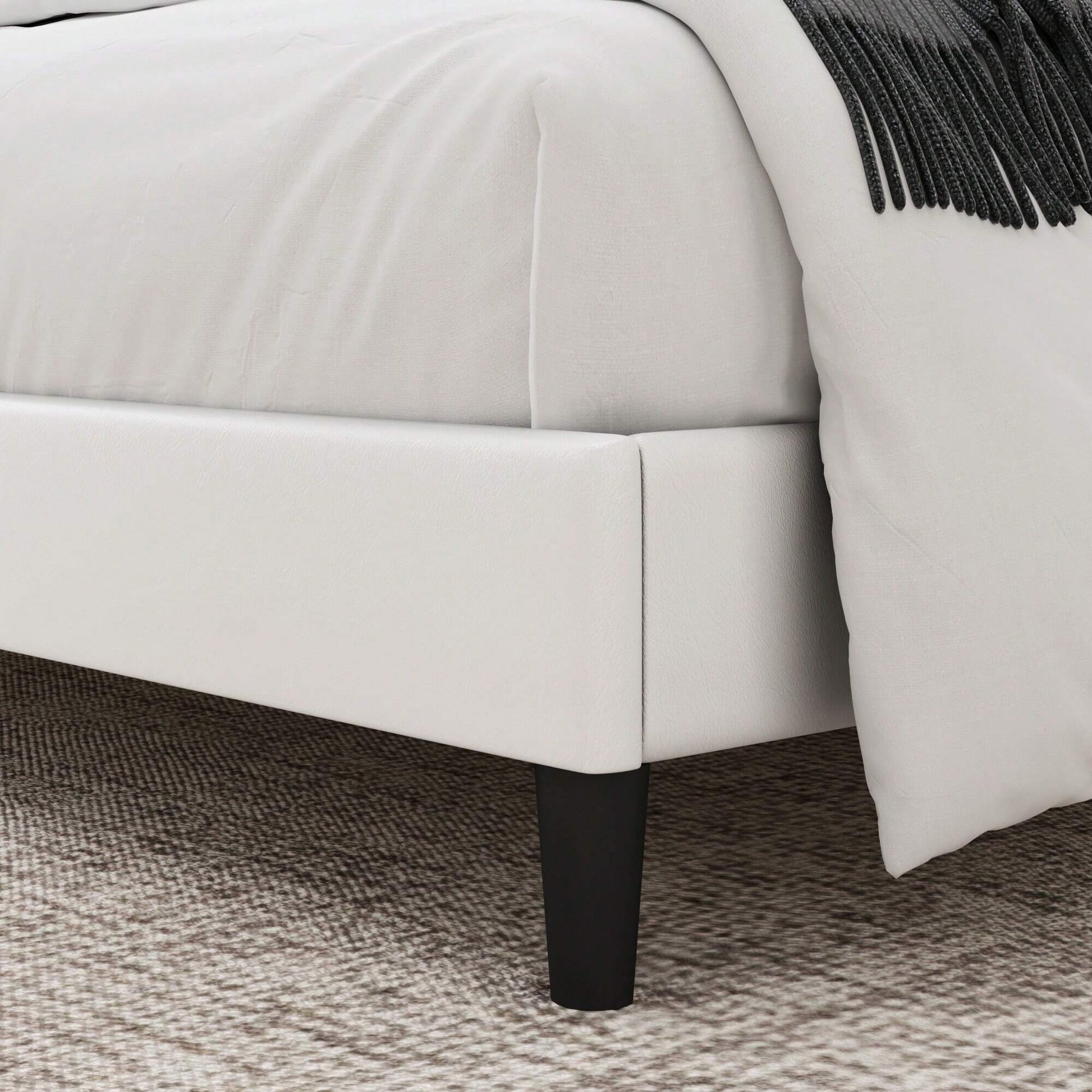 The VALEN Platform Bed Frame in white features a sleek leather upholstery and a sturdy steel frame with wood slats, eliminating the need for a box spring. Its padded, tufted headboard adds a stylish touch, while 6” of under-bed space offers extra storage. Supporting up to 800 lbs, it’s designed for stability and pairs perfectly with a 10-12" mattress (sold separately).